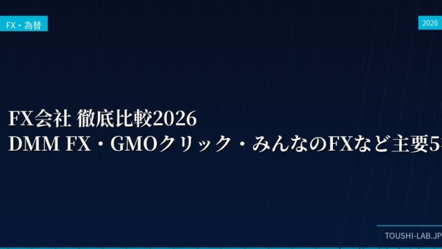 FX・為替 FX会社 徹底比較2026|DMM FX・GMOクリック・みんなのFXなど主要5社をプロが分析 2026年最新のFX会社徹底比較。DMM FX、GMOクリック証券、みんなのFX、LIGHT FX、SBI FXトレードの5社をスプレッド、スワップ、ツール、約定力で比較分析。あなたに最適な口座がわかります。 2026.03.18 FX・為替